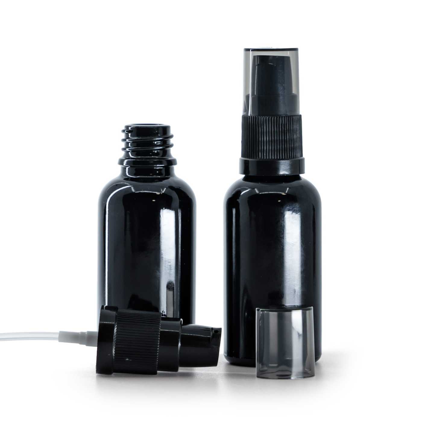 Distributeur de crème en plastique noir avec bouchon opaque noir. Il convient à tous nos flacons en verre.