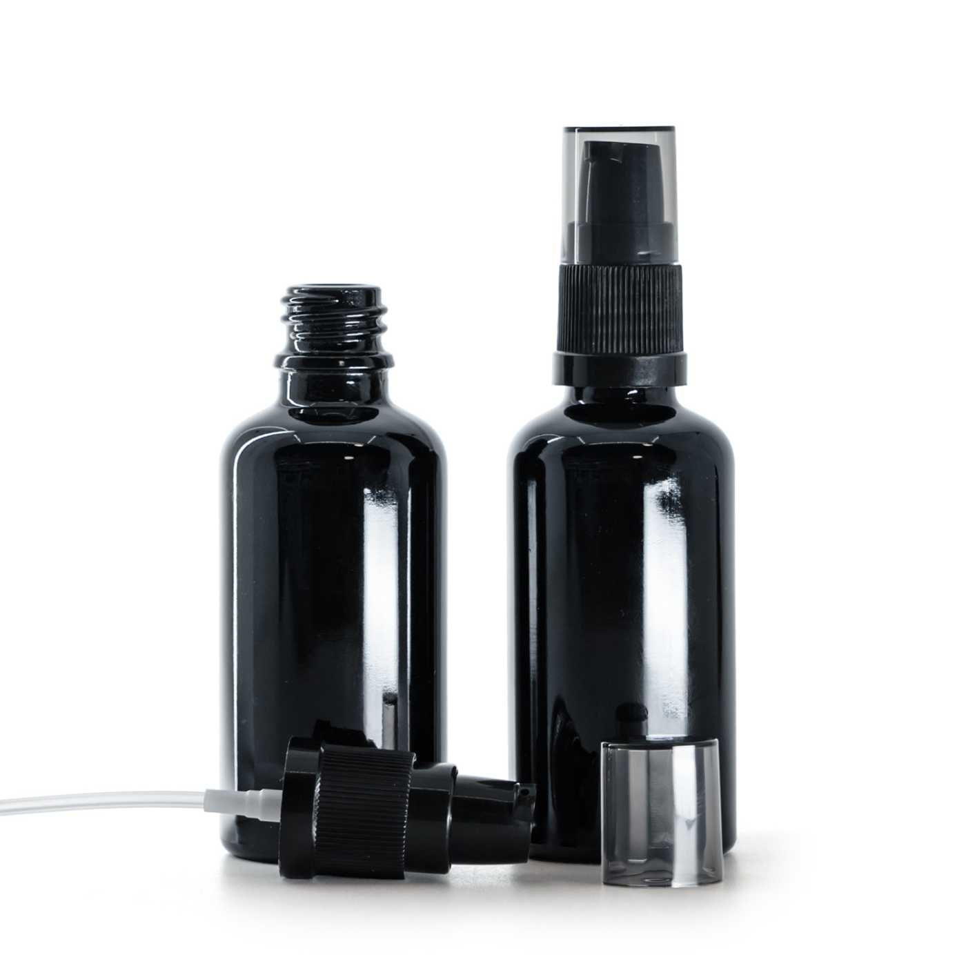 Distributeur de crème en plastique noir avec bouchon opaque noir. Il convient à tous nos flacons en verre.