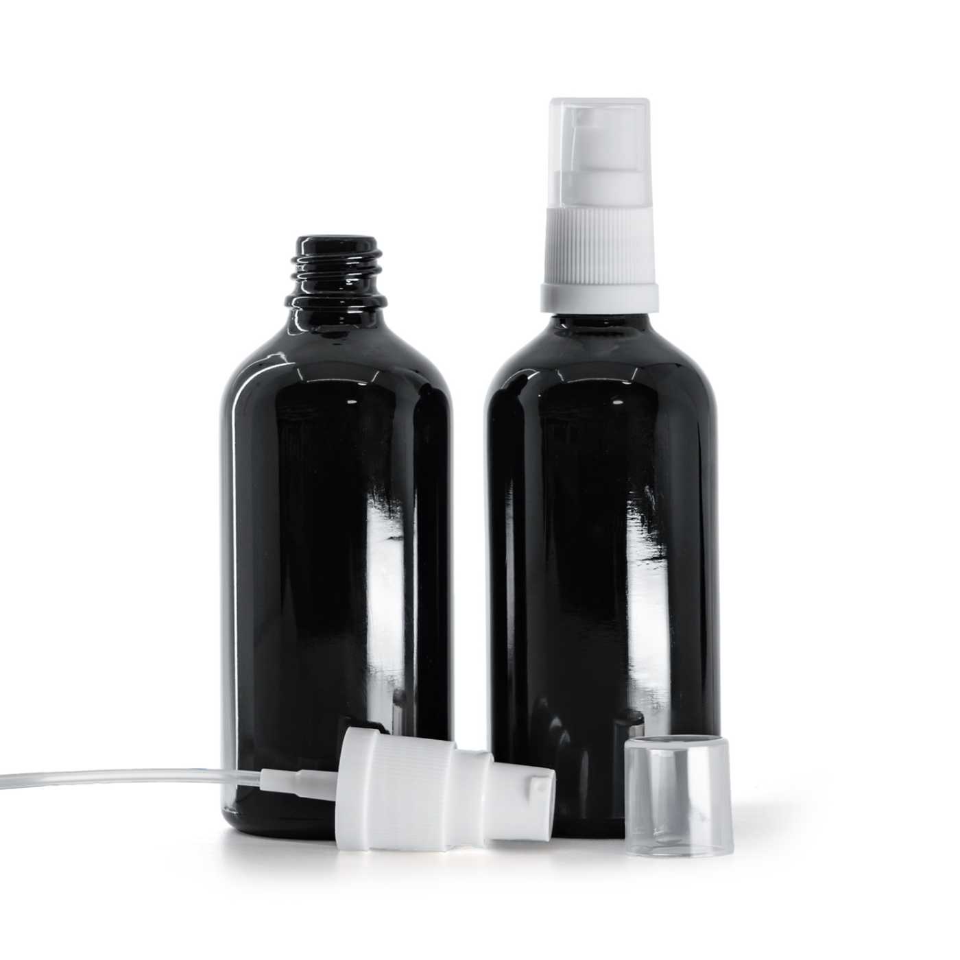 Flacon en verre noir brillant avec pompe blanche 100 ml représente un emballage professionnel adapté au conditionnement de divers produits liquides pour lesquel... description complète