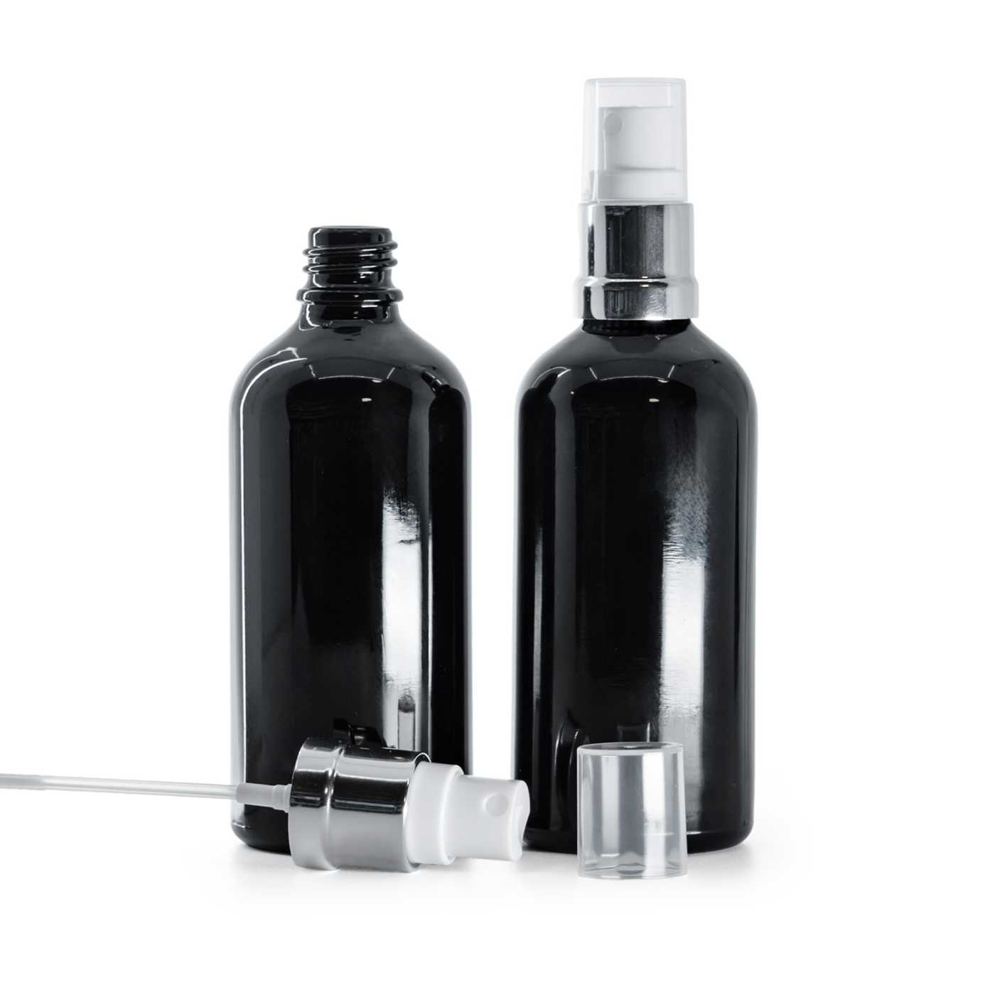 Flacon en verre noir brillant, spray blanc argenté brillant, 100 ml