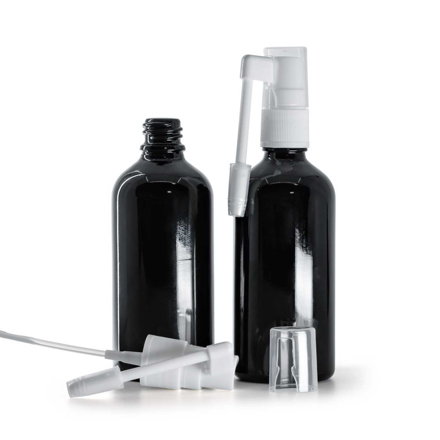 Applicateur de liquide de gorge en plastique de couleur blanche. Le spray buccal peut être utilisé avec tous les flacons en verre ayant un col de 18 mm.