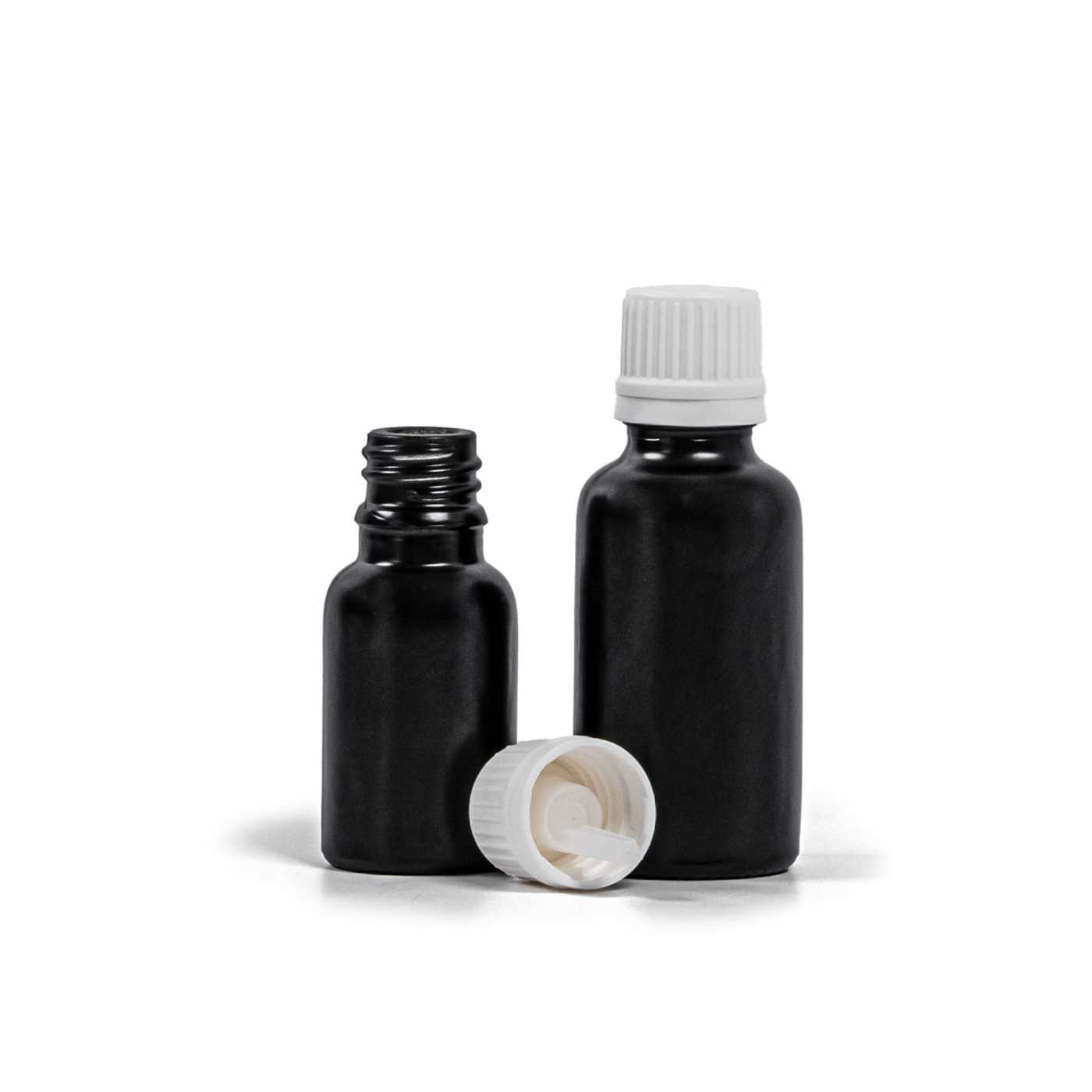 Flacon en verre noir mat, bouchon blanc inviolable et compte-gouttes, 30 ml