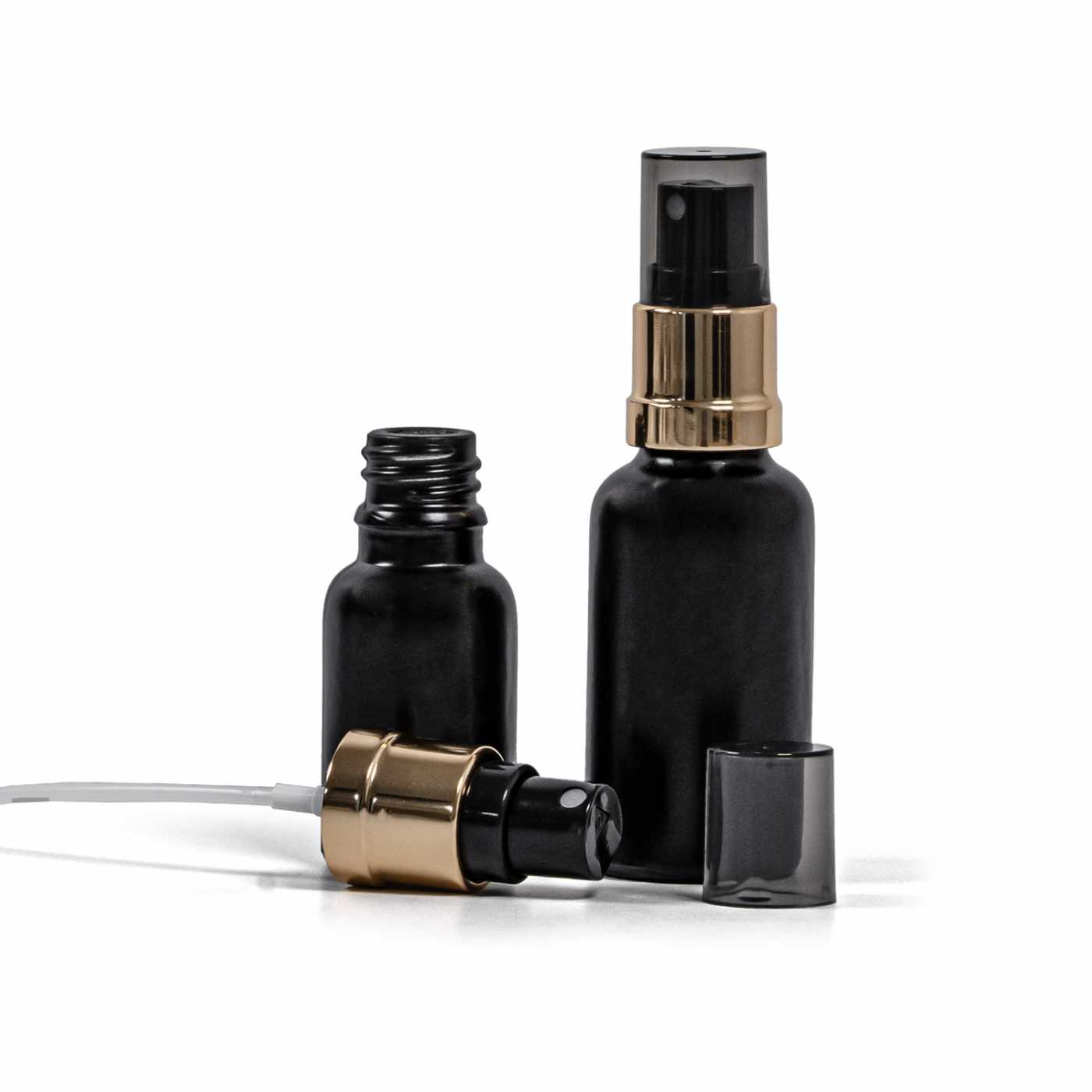 Flacon en verre noir mat, pompe spray noir et or, surcapot fumé, 15 ml