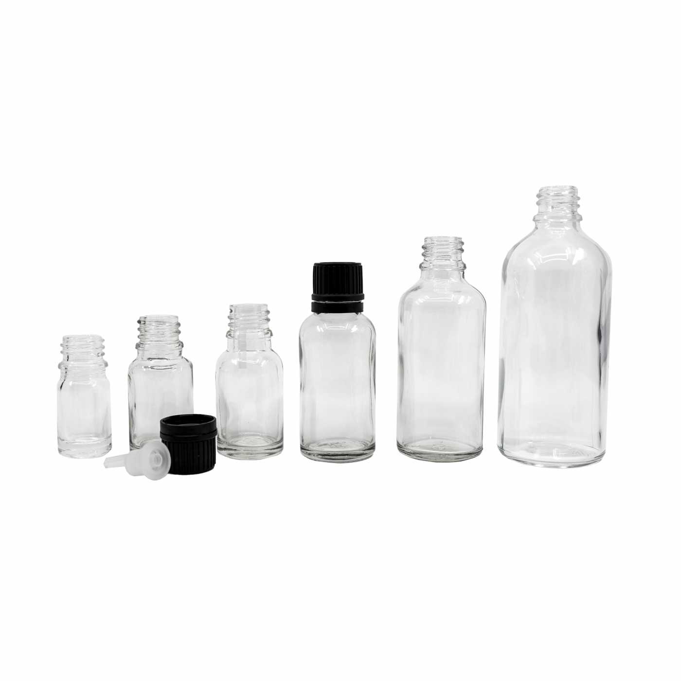 Flacon en verre transparent, bouchon noir et compte-gouttes 15 ml