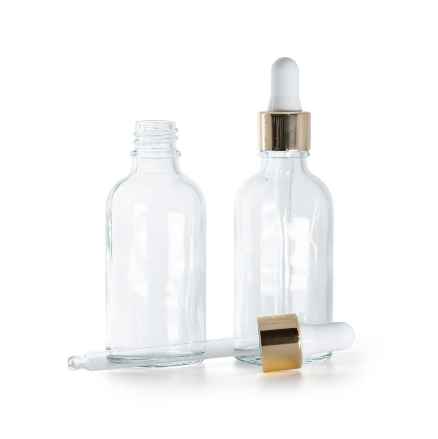 Flacon en verre transparent, pipette blanche et dorée, 30 ml