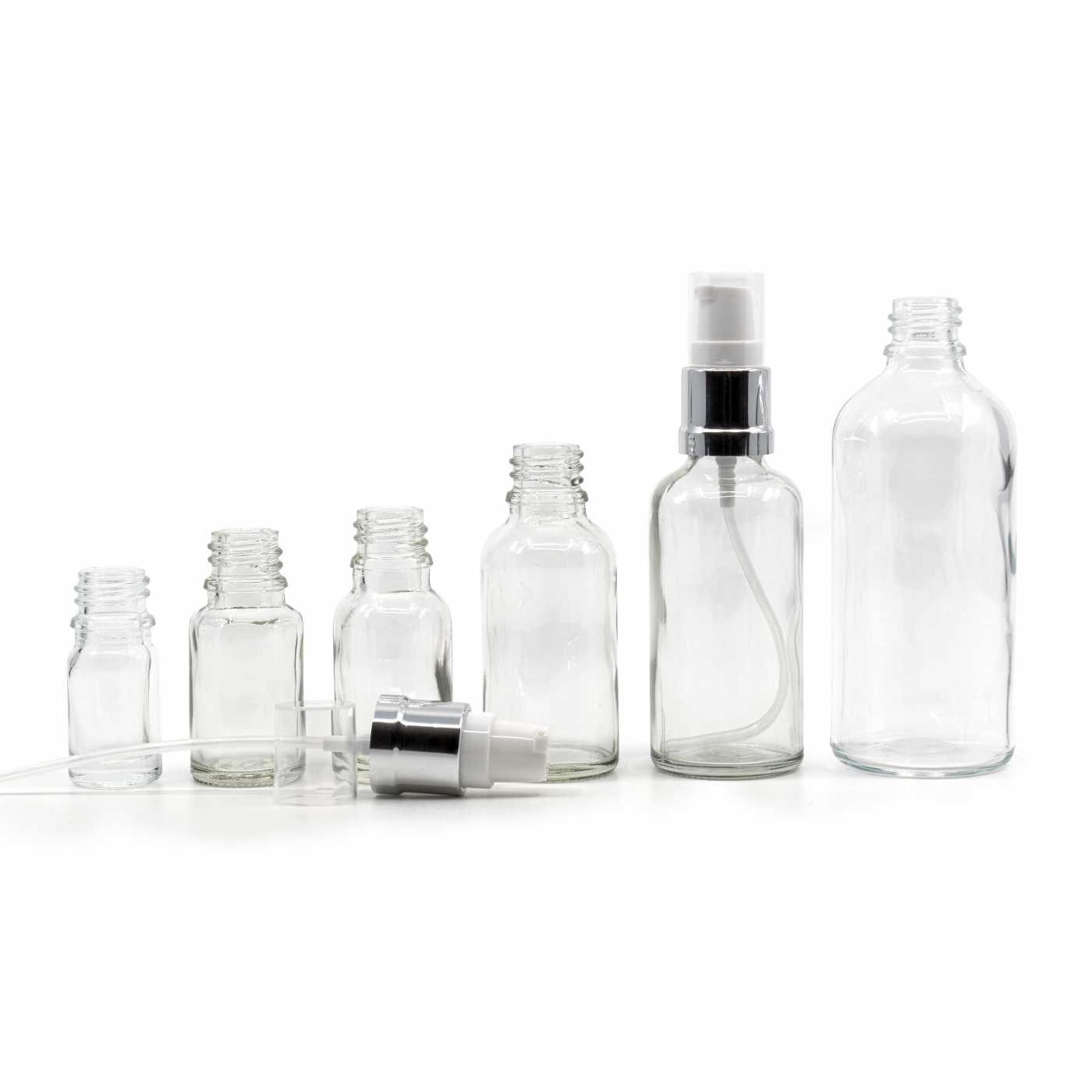 Flacon en verre transparent, pompe en argent brillant blanc, 15 ml