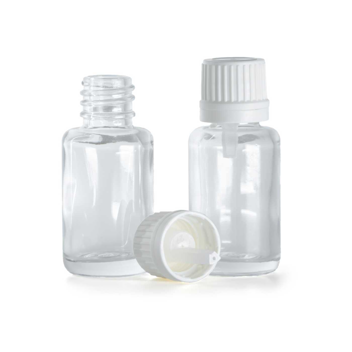 Flacon en verre transparent, rond, bouchon blanc inviolable et compte-gouttes, 12 ml