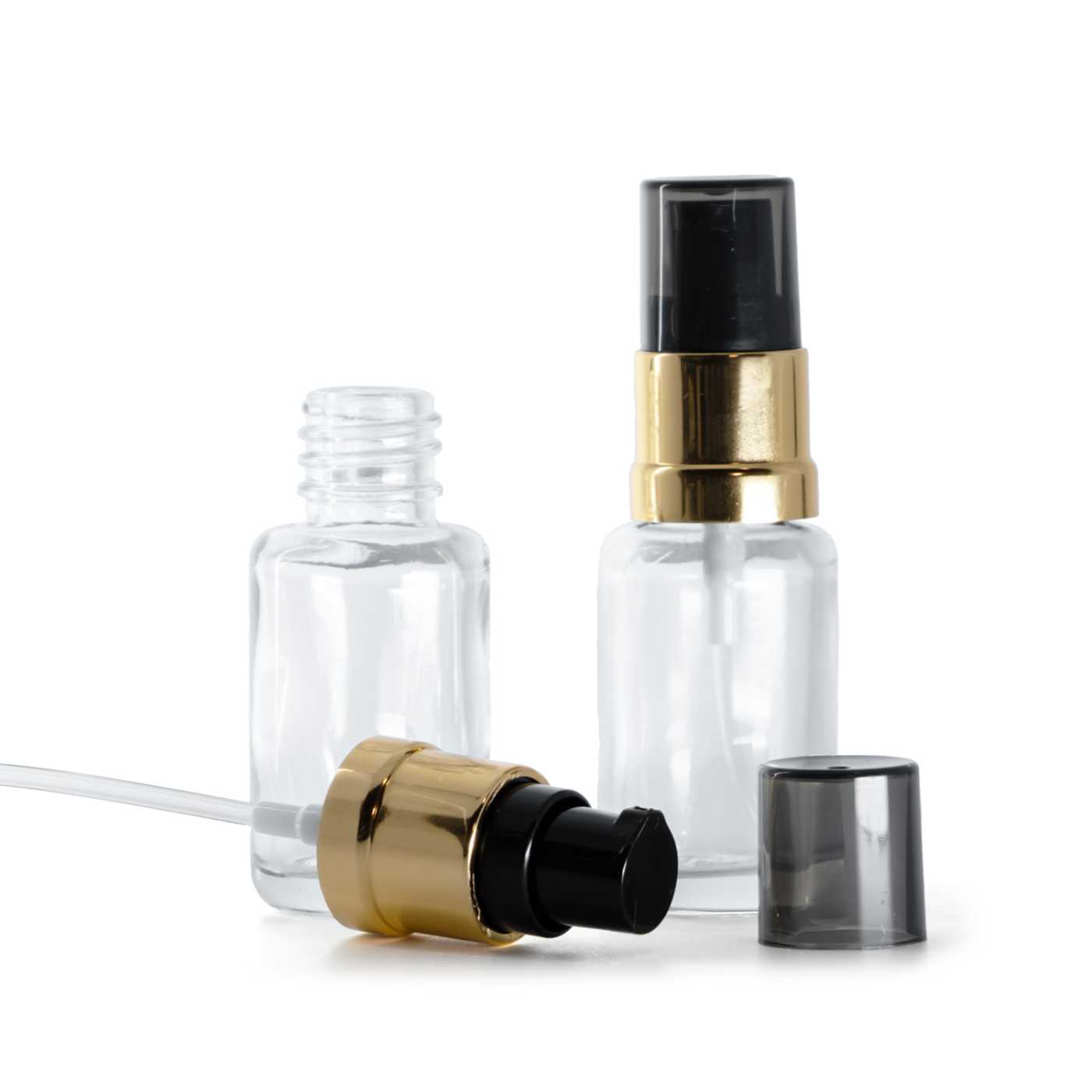 Flacon en verre transparent, rond, pompe noire dorée brillante, 12 ml