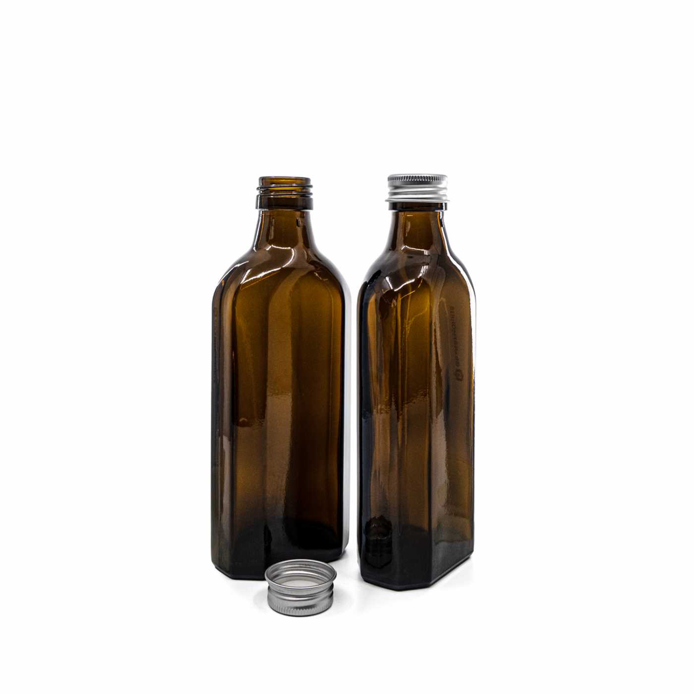 Flacon médical en verre ambré, plat, PP28, 250 ml, bouchon en aluminium argenté