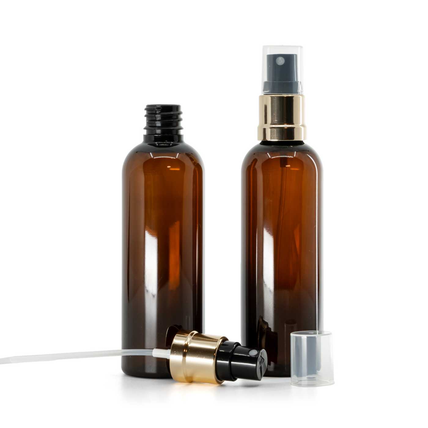 Flacon plastique ambré avec pompe spray noir et or, 100 ml