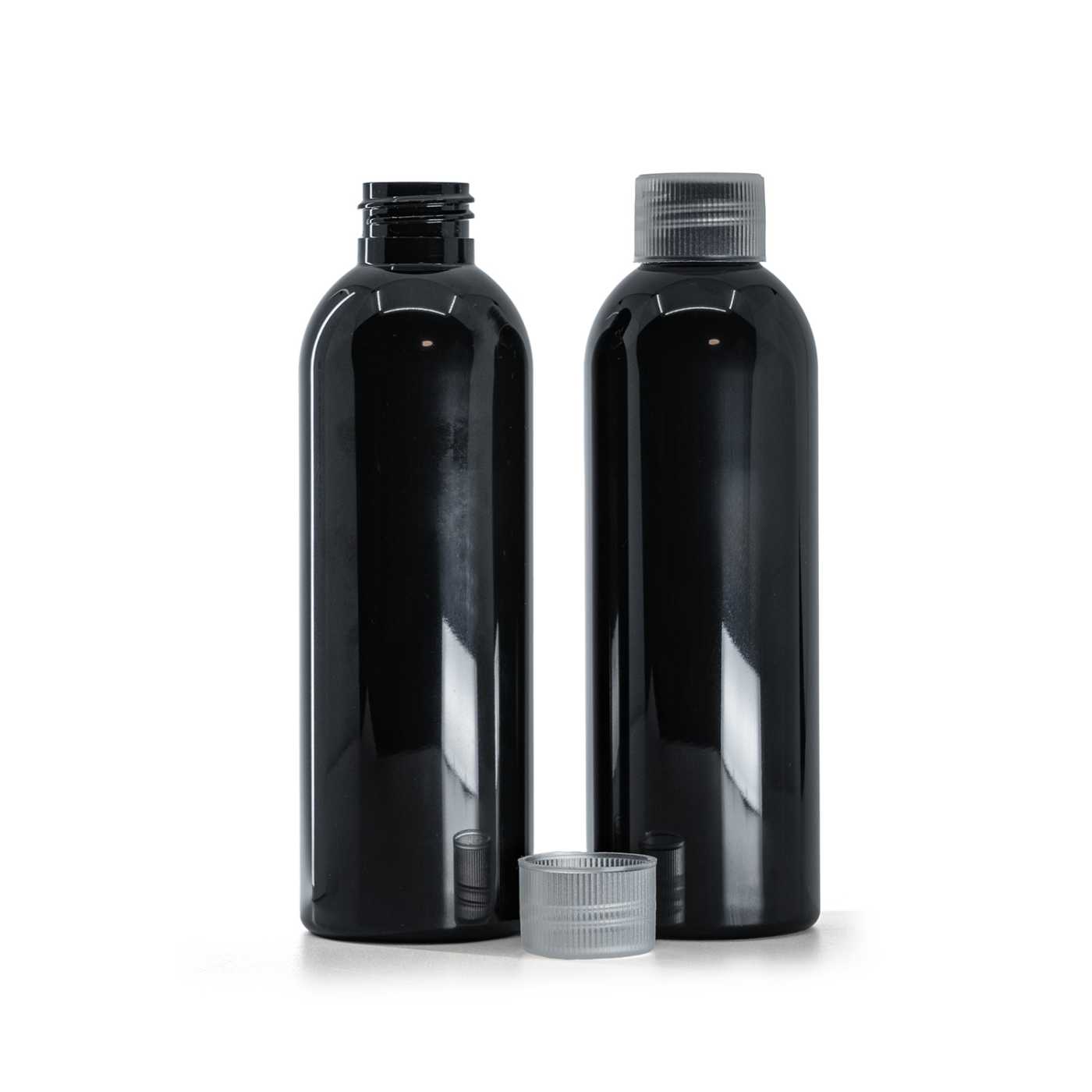 Flacon plastique noir brillant avec bouchon transparent, 200 ml