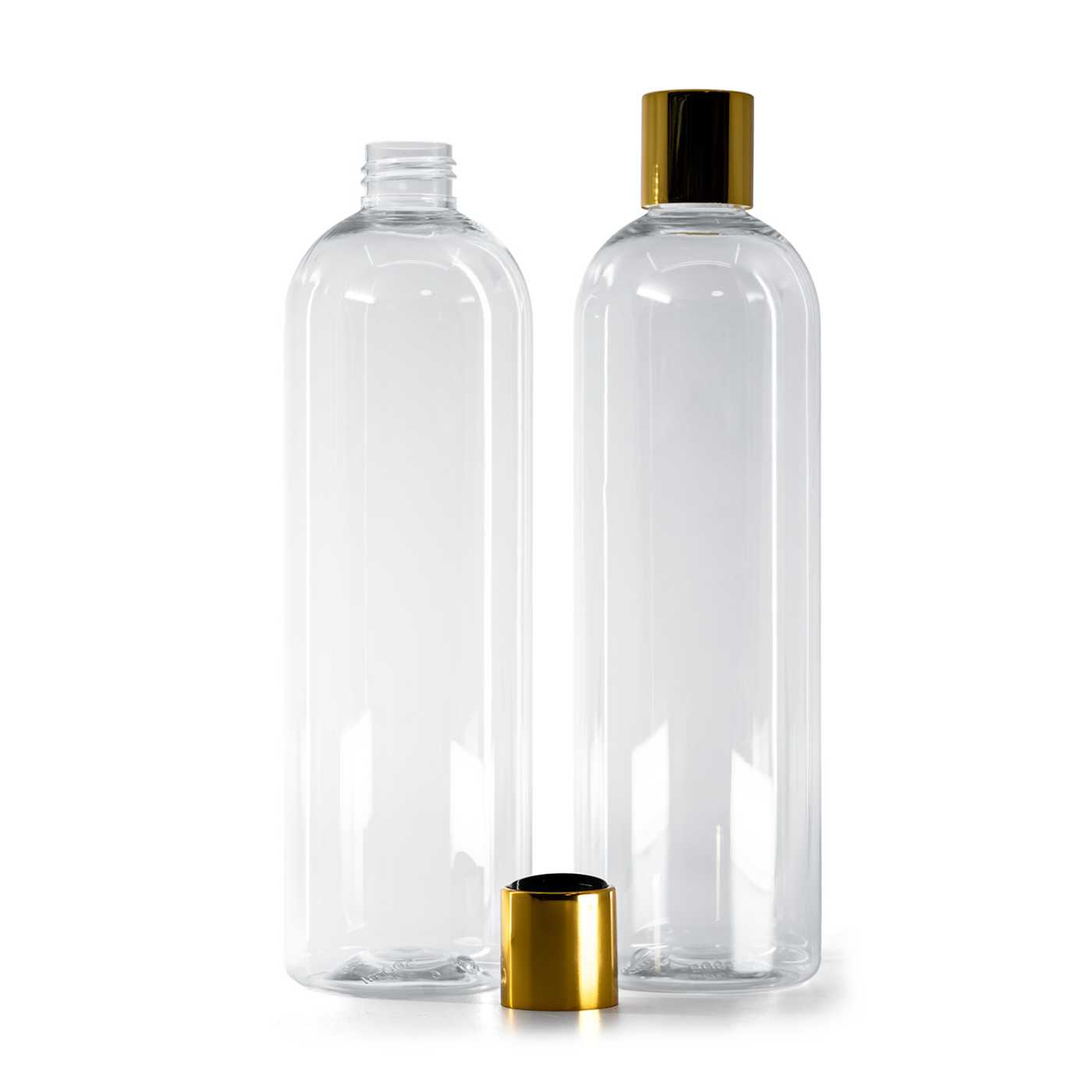 Flacon plastique rond transparent, bouchon disc top doré avec centre noir, 500 ml