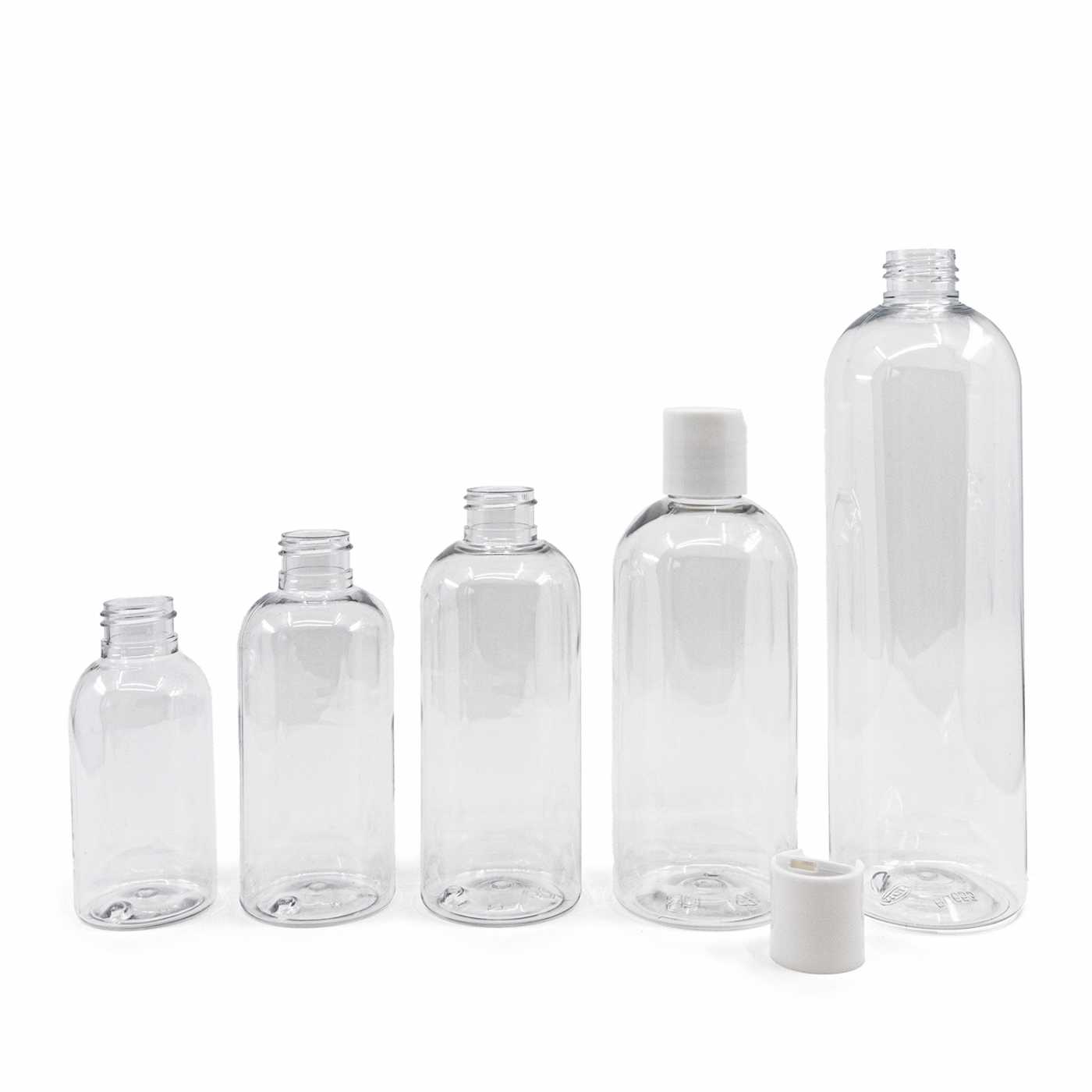 Flacon plastique rond transparent, capsule disc top blanche, 300 ml