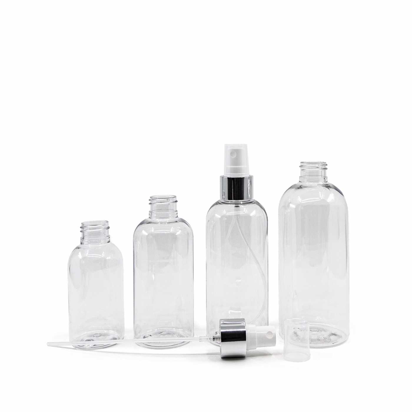 Flacon rond en plastique transparent, pompe spray blanche, bague argentée brillante, 300 ml