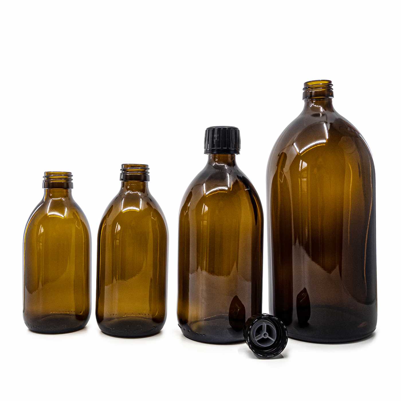 Flacon sirop rond en verre ambré, 28 mm, bouchon noir avec insert verseur, 300 ml