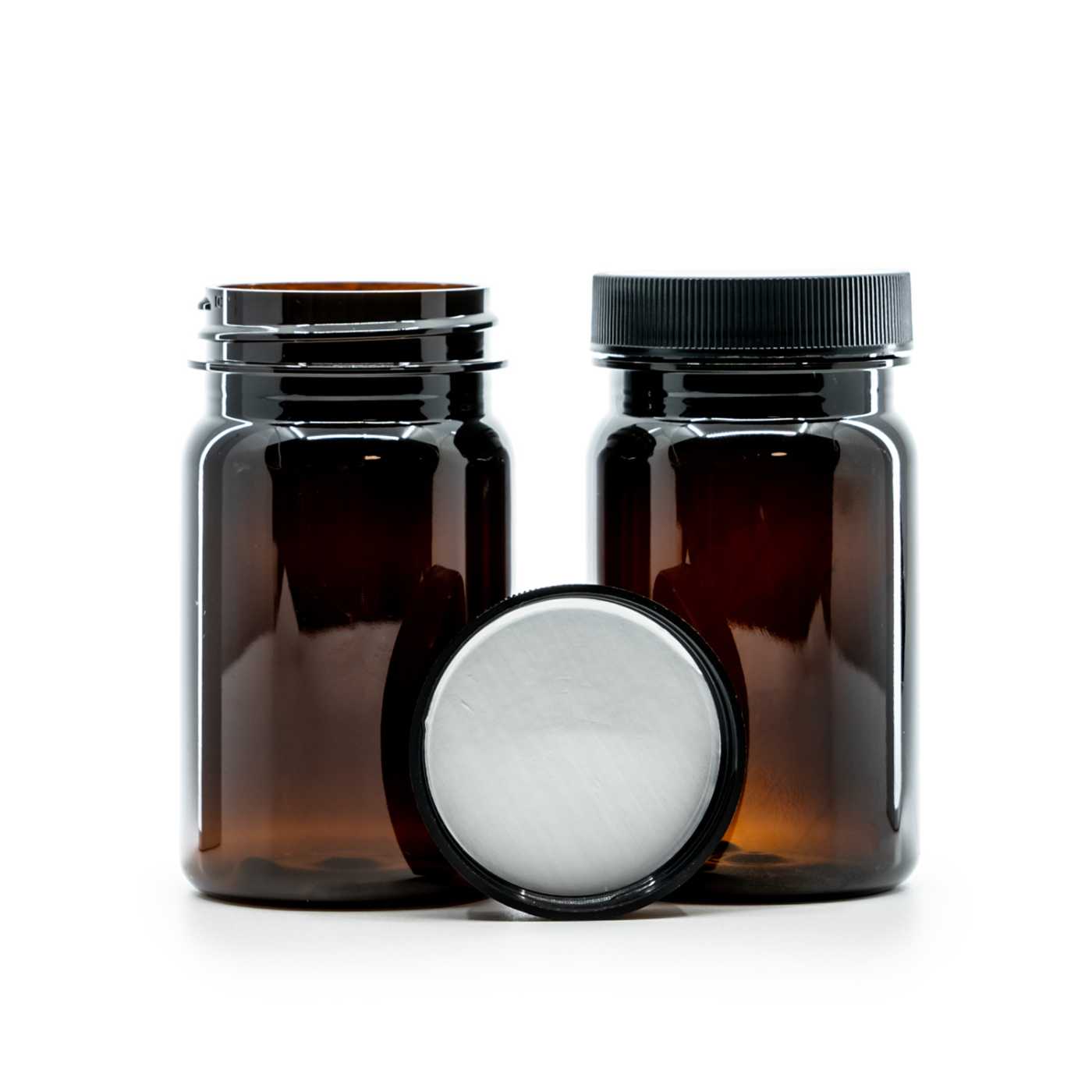 Pilulier en plastique ambré, bouchon noir, opercule d’induction, 100 ml
