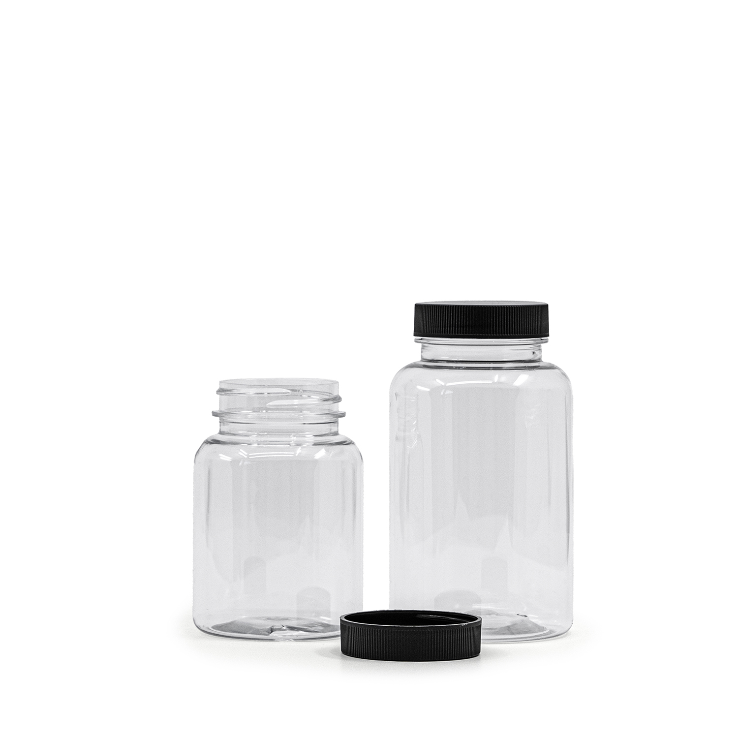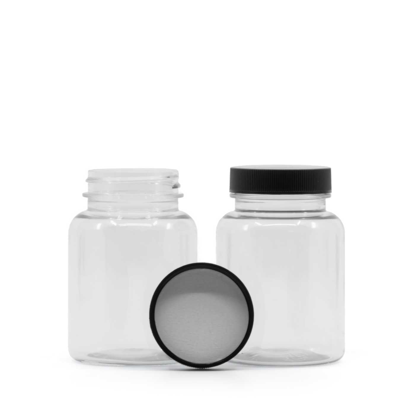 Pot en plastique transparent pour comprimés, couvercle noir, opercule d’induction, 150 ml