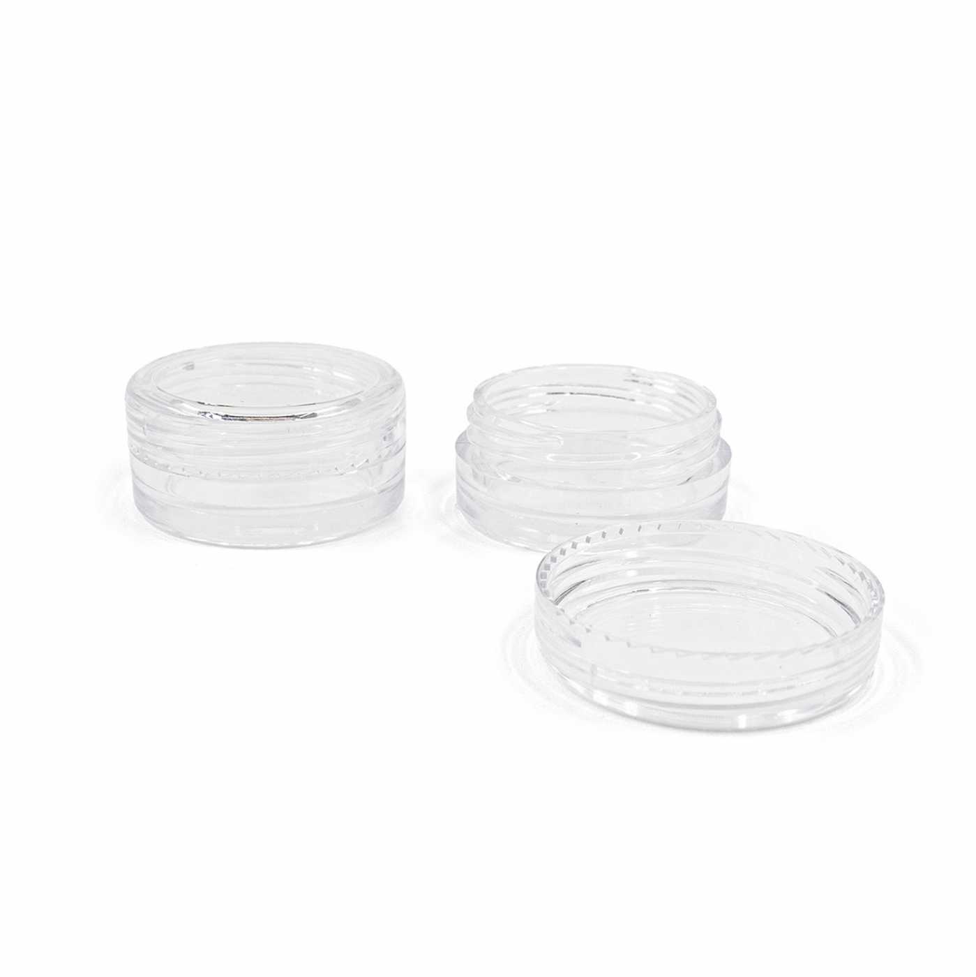 Boîte ronde en plastique transparente avec couvercle à vis d’une capacité allant jusqu’à 20 ml.... description complète
