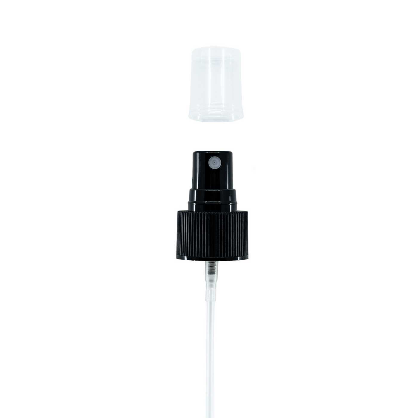 Distributeur en plastique noir - moleté avec bouchon transparent, adapté aux bouteilles avec un diamètre de col de 24 mm.