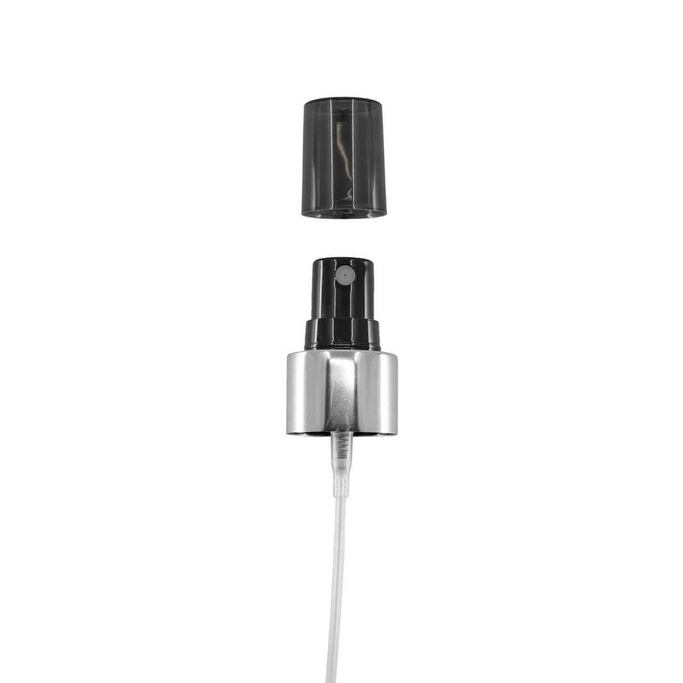 Vaporisateur en plastique noir avec bouchon transparent et col argenté brillant d'un diamètre de 24 mm.