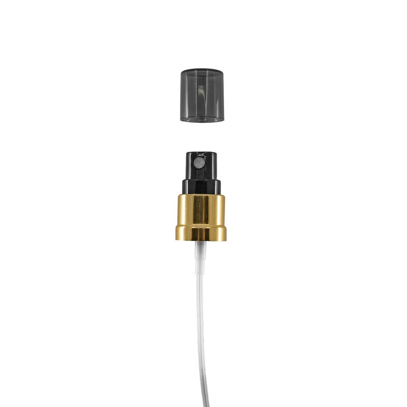 Vaporisateur en plastique noir et or avec bouchon fumigène transparent, adapté aux flacons avec un diamètre de col de 18 mm.Col : 18/415Longueur du tube : 115 mmDosage : 0,14 ml chacun